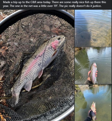 Changes each Season with larger trout noted in past stockings. For this Season, have been monitoring reports that indicate sizeable trout in the area. Picture below was posted 6 days ago.